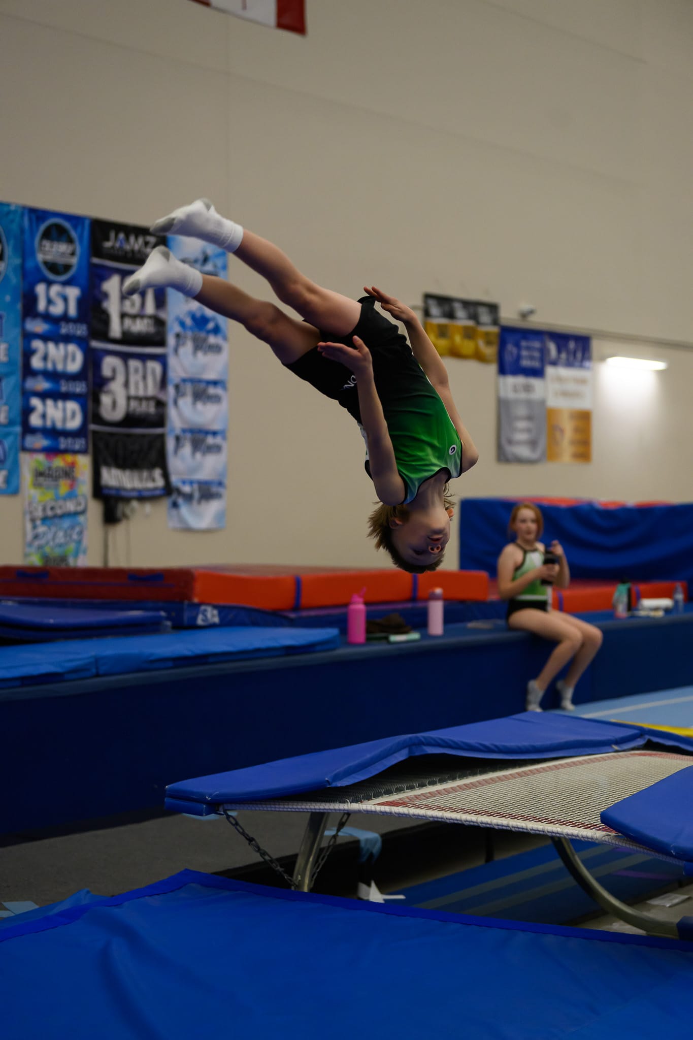 This 1-hour weekly class introduces athletes to intermediate skills in tumbling, trampoline, and double mini. Participants will work on developing more advanced tumbling techniques, learn how to incorporate twists on the trampoline, and refine their skills on the double mini-tramp.